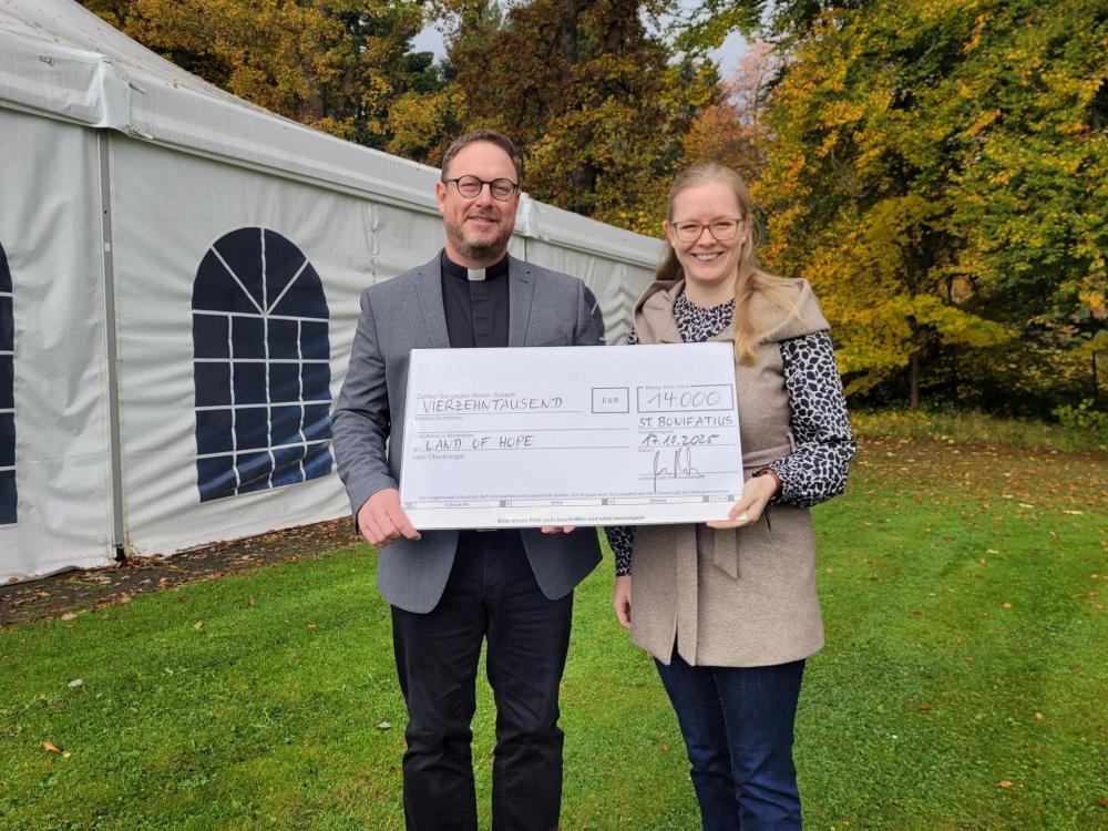 Eine unfassbar große Spendenbereitschaft zeigten die Besucherinnen und Besucher der Gottesdienste auch in dieser Zeltkirchsaison. 12.936,38 € wurden von Ostern bis Oktober gespendet. Das Bildungs- und Exerzitienhaus St. Bonifatius rundete die Spende auf 14.000 € auf. Sie unterstützt nun die Arbeit der gemeinnützigen Organisation Land of Hope in Nigeria. Im Kinderzentrum leben 94 Kinder, die des Hexereivorwurfs beschuldigt und zu Sündenböcken für die schwierigen Lebensbedingungen der Erwachsenen gemacht wurden. Land of Hope setzt sich mit Liebe, Zeit, Leidenschaft, Hoffnung, Integration, Bildung und Aufklärung für die Rechte dieser Kinder ein. Herzlichen Dank allen Spenderinnen und Spendern für die großzügige Unterstützung des Projekts!